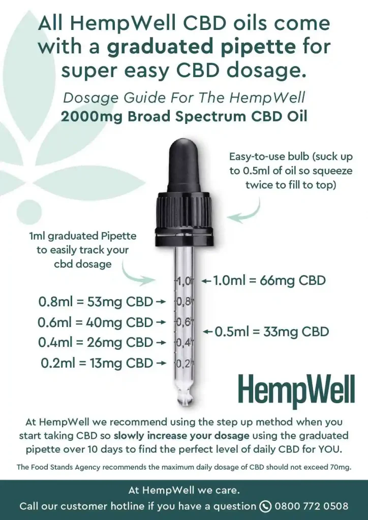 The Food Standards Agency in the UK recommends the maximum daily CBD dosage of 70mg. Do not exceed the recommended daily dose. Please consult a health professional before use if pregnant, breastfeeding or taking medication. HempWell products should be taken or used as part of a varied diet and healthy lifestyle. This product is not intended to diagnose, treat, cure or prevent any disease.