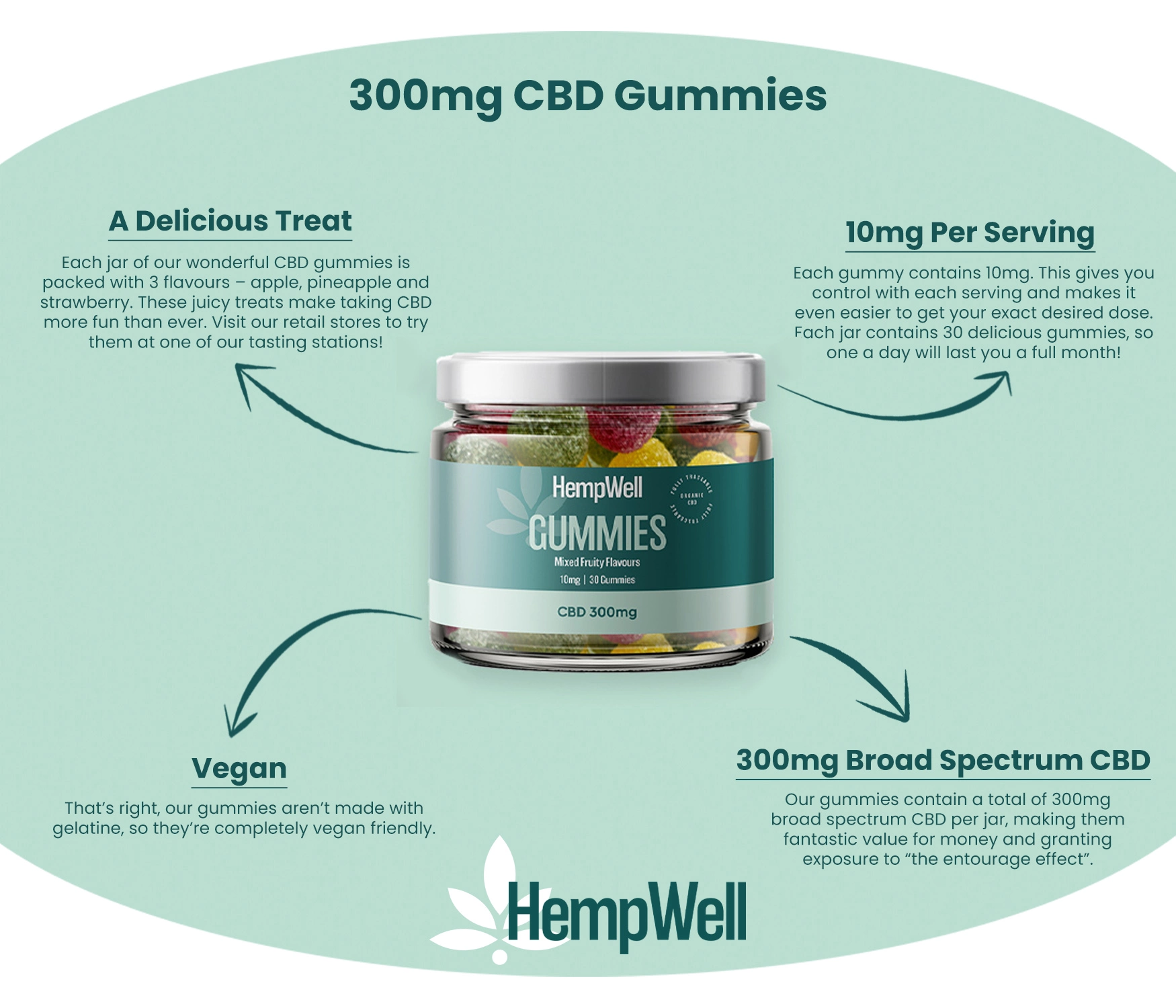 HempWell CBD gummies 300mg are the best CBD gummies in Ireland, we’re sure of it! These delicious broad spectrum CBD gummies are completely vegan too! Each jar comes with 3 great flavours of CBD gummy. Not only this is product a fun way to get your CBD fix but it is also a great way to control your CBD dosage, with an exact amount of broad spectrum CBD in each individual gummy. That makes them great for new CBD users. Although, in our experience, long-time CBD fans love them too. You can visit one of our retail stores to try a sample, or easily buy CBD gummies online using our CBD shop.