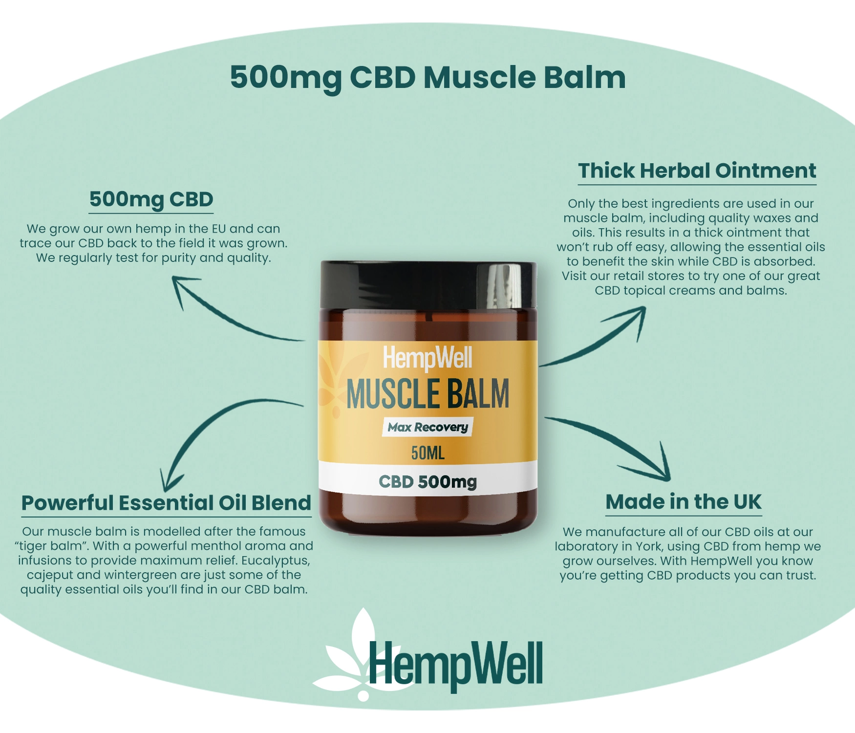 If you’re looking to buy CBD muscle balm that’s beautifully crafted with a range essential oils then we can help. Our CBD shop has the best CBD muscle balm in Ireland. Modelled after the famous tiger balm, this CBD muscle balm is designed to provide maximum relief to muscles. Hemp creams and balms have exploded in popularity in recent years and each jar of HempWell balm contains our organically grown CBD. We manufacture all of our topical CBD products in the UK and regularly test via third-parties for quality and purity. Each of our CBD balms, creams and CBD skin care products also have a valid CPSR certification. When you use our online CBD shop, you can have confidence in quality.