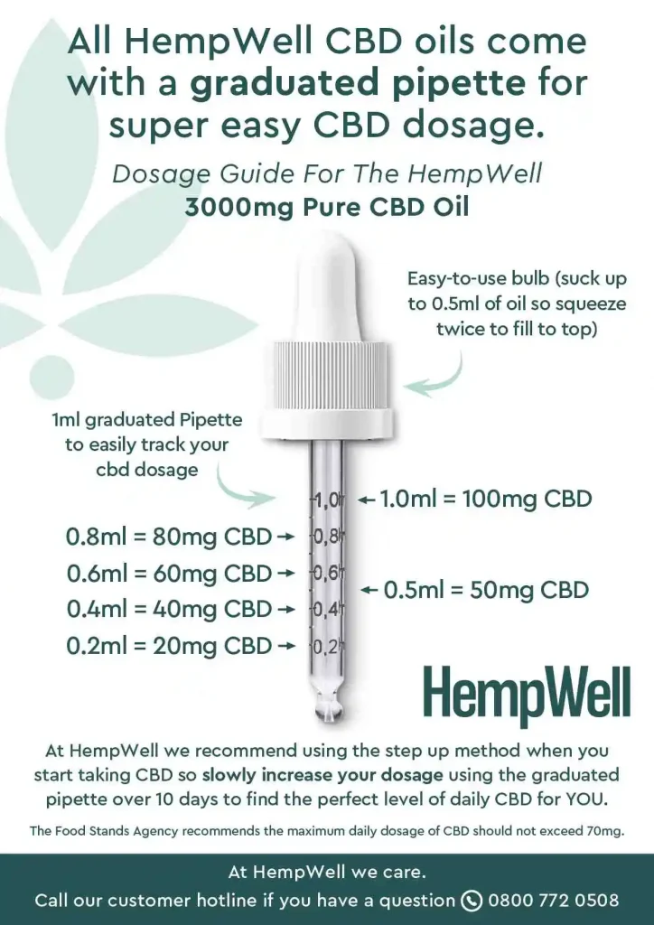 The Food Standards Agency in the UK recommends the maximum daily CBD dosage of 70mg. Do not exceed the recommended daily dose. Please consult a health professional before use if pregnant, breastfeeding or taking medication. HempWell products should be taken or used as part of a varied diet and healthy lifestyle. This product is not intended to diagnose, treat, cure or prevent any disease.